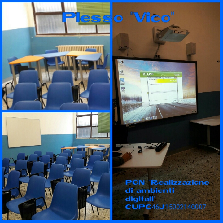 Nell’edificio della Scuola Secondaria di I Grado “G. Vico”, l’ambiente realizzato consiste in uno spazio alternativo per l’apprendimento con dotazione multimediale, utilizzabile da tutte le classi della scuola e dotata di arredi e tecnologie per la fruizione individuale e collettiva delle lezioni. L’aula così come strutturata permette la rimodulazione continua degli spazi in coerenza con l’attività didattica prescelta, per singole classi, per classi omogenee o per gruppi di ragazzi. Lo spazio è finalizzato anche alla formazione dei docenti interna alla scuola. La nuova aula-laboratorio è dotata di banchi modulari e componibili per il lavoro a gruppi e fortemente high-tech grazie alla presenza di un Touch Panel e di un videoproiettore interattivo collegabile con ogni tipo di device in uso (tablet, PC/portatili). Il touchscreen sostituisce la tradizionale lavagna e collega il docente con alunni e proiezioni. È un’interazione totale di tutti verso tutti per un utilizzo della tecnologia più avanzata al fine di un apprendimento attivo, interazioni continue e dinamiche tra studenti e docente e attività dove lo studente si senta il protagonista.